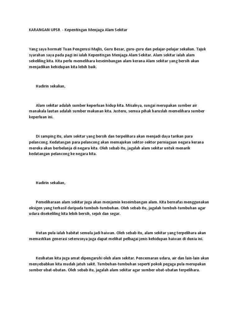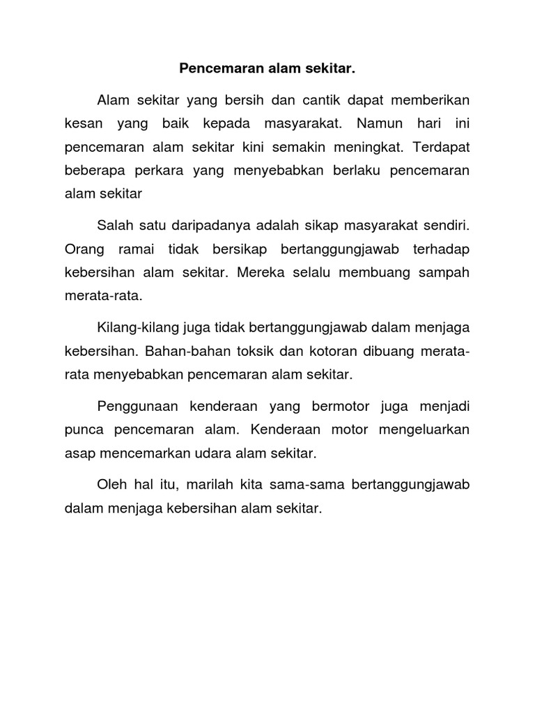 Sering meniti dari bibir ke bibir masyarakat mengenai isu pencemaran alam sekitar iaitu pencemaran air udara dan darat. Contoh Karangan Bahasa Melayu UPSR a. Karangan Spm Alam Sekitar Contoh Karangan Spm - Bentuk karangan berformat u umum 35.